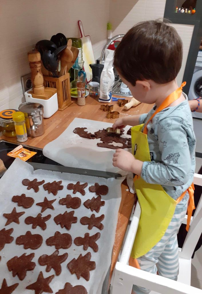 - Espolvorea la mesa de trabajo con un poco de harina, coloca encima la masa y extiéndela con un rodillo formando una lámina de 1 – 2 cm de grosor. Corta las galletas con cortapastas navideños y colócalas en la bandeja del horno forrada con papel para hornear.