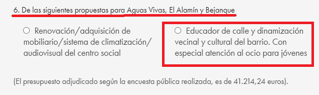 Lamentablemente, después, los técnicos del ayuntamiento desestimaron la construcción de la pista deportiva porque el presupuesto era insuficiente, quedando así la propuesta en «Educador de calle y dinamización vecinal y cultural del barrio. Con especial atención al ocio para jóvenes»