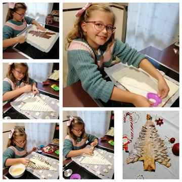 - Luego haz cortes de 2 cm, paralelos a la base sin llegar al centro para hacer las ramas. Gira 2-3 veces las ramas haciendo tirabuzones. Coloca el árbol con el papel en una bandeja de horno. Puedes hacer galletas con la masa sobrante ayudándote de moldes navideños.