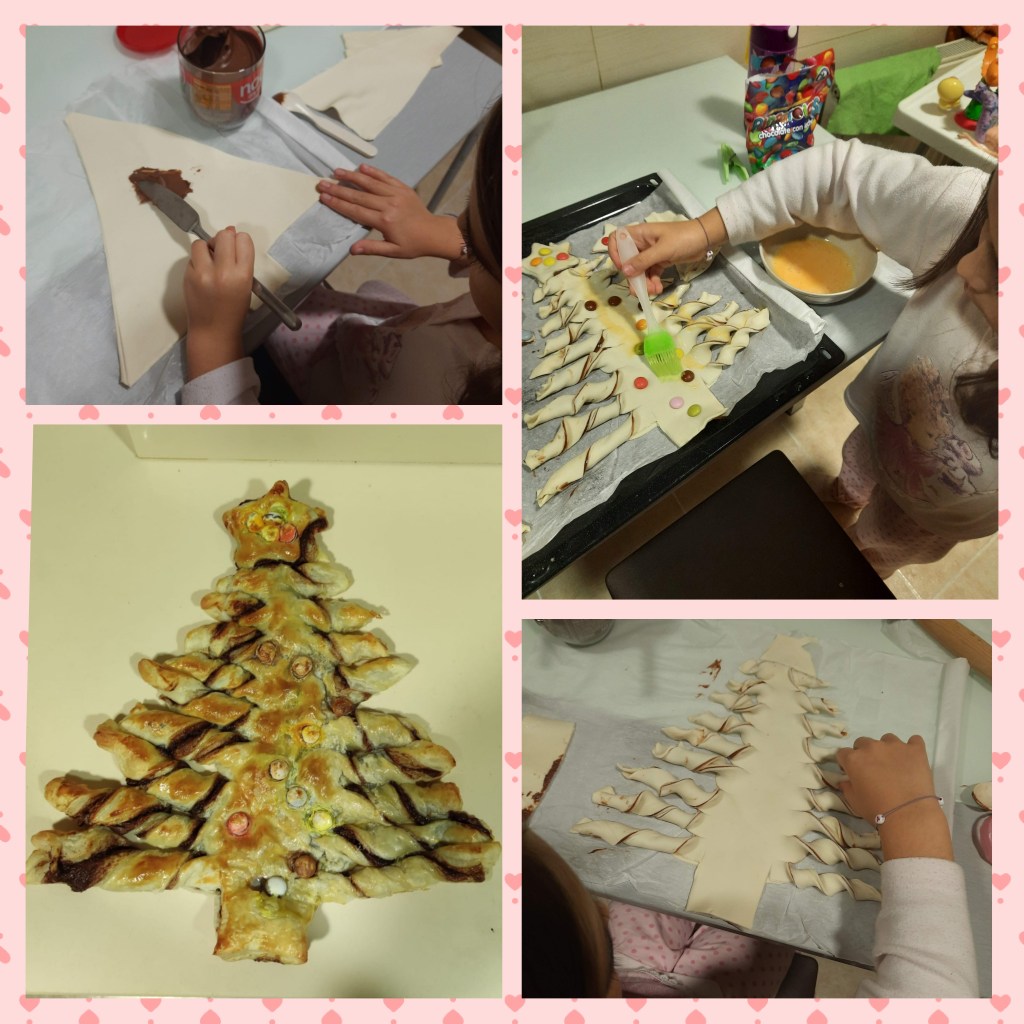 3. Cortamos la forma de un árbol de navidad y con el hojaldre restante hacemos estrellas con moldes.