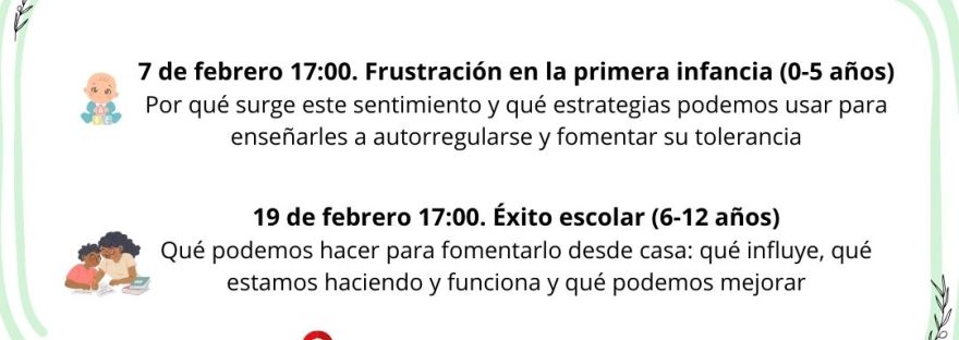 Continuamos en marzo con dos nuevos talleres, destinados a la orientación y asesoramiento a familias para la crianza y atención de sus hij@s. Los talleres serán impartidos por la asociación TSIS, dentro de su programa Aula de Familias. Los Talleres Educación sexual integral en la primera infancia (0-5 años). 13 de marzo a las 17h. Educación… Sigue leyendo Aulas de Familia