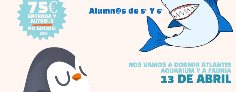 El sábado 13 de abril nos vamos de excursión!! Los alumnos de 3º y 4º pasarán la noche en Faunia durmiendo entre pingüinos y los de 5º y 6º lo harán en Atlantis Aquarium durmiendo con los tiburones. Plazas disponibles Disponemos de 60 plazas para cada una de las actividades. Inscripciones Si quieres apuntarte a dormir… Sigue leyendo Durmiendo con Pingüinos y Tiburones