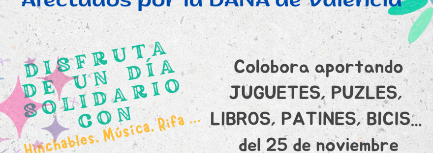 Desde el AMPA, y en colaboración con todas las familias del centro, queremos ayudar a los afectados por la DANA de Valencia, con una aportación económica. Aún no hemos decidido a que entidad se donará el dinero, pero nos gustaría que fuera destinado a la reconstrucción de la vida familiar y escolar de los niños… Sigue leyendo Ayuda a los afectados por la DANA en Valencia