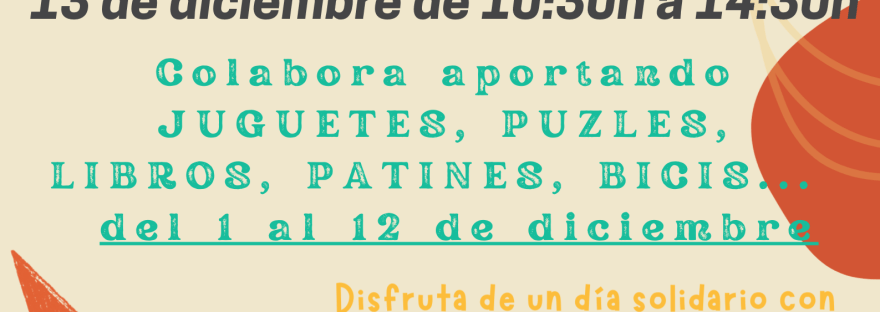 ¡Somos un cole solidario! El día 16 de diciembre de 11h a 15h tendrá lugar el en el polideportivo del colegio el VI Mercadillo Solidario de Juguetes. Desde hoy y HASTA EL 15 DE DICIEMBRE, RECOGEMOS JUGUETES usados en buen estado o nuevos. Aprovecha esta oportunidad para hacer limpieza de armarios y dar una nueva vida a… Sigue leyendo VI Mercadillo Solidario de Juguetes