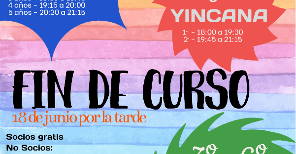 Atendiendo al número final de niños y niñas apuntados a las actividades de fin de curso, hemos modificado los horarios de la siguiente manera: MAGIA INFANTIL:▪️ 1er turno, de 18:45 a 19:30 : 3 años A, 3 años B Y 4 años A▪️ 2º turno, de 19:45 a 20:30 : 4 años B, 5 años… Sigue leyendo IMPORTANTE: CAMBIO EN HORARIOS DE ACTIVIDADES DE FIN DE CURSO