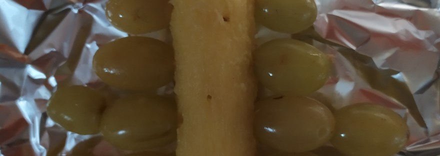 Preparación Usaremos la parte de en medio de la piña dura que no se come para clavar barillas de madera a modo de ramas y vamos pinchando uvas hasta conseguir darle forma y luego con una fresa haremos la estrella. El resultado Si os ha gustado, recordad, ¡un comentario es un voto!